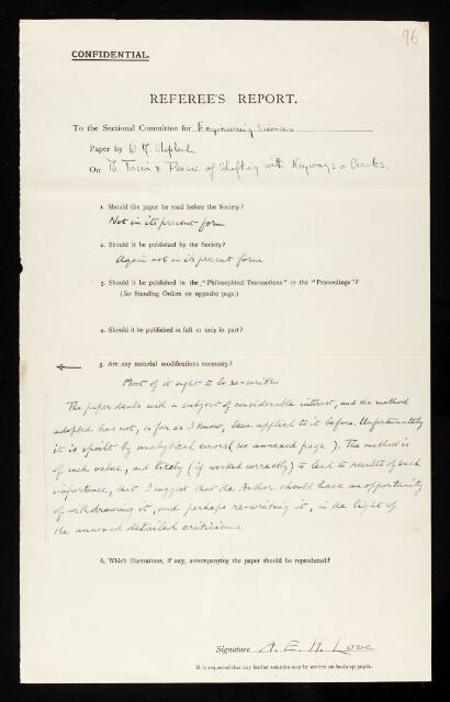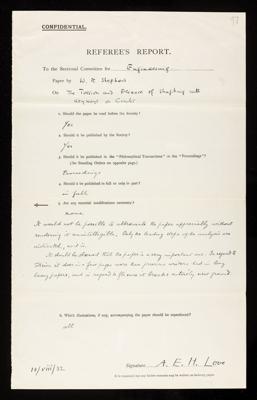 Augustus Edward Hough Love, Referee's report by Augustus Edward Hough Love, on a paper The torsion and flexure of shafting with keyways or cracks' by W M Shepherd, June 1932, RR/47/96, The Royal Society Archives, London, https://makingscience.royalsociety.org/items/rr_47_96/referees-report-by-augustus-edward-hough-love-on-a-paper-the-torsion-and-flexure-of-shafting-with-keyways-or-cracks-by-w-m-shepherd, accessed on 16 February 2026