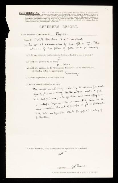 George Paget Thomson, Referee's report by George Paget Thomson, on a paper 'An optical examination of thin films. II.—The behaviour of thin films of fatty acids on mercury' by C G P Feachem and Leif Tronstad, January 1934, RR/48/76, The Royal Society Archives, London, https://makingscience.royalsociety.org/items/rr_48_76/referees-report-by-george-paget-thomson-on-a-paper-an-optical-examination-of-thin-films-iithe-behaviour-of-thin-films-of-fatty-acids-on-mercury-by-c-g-p-feachem-and-leif-tronstad, accessed on 15 February 2026