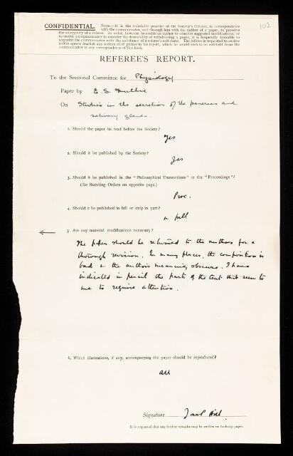James Peter Hill, Referee's report by James Peter Hill, on a paper 'Studies in the secretion of the pancreas and salivary glands' by E S Duthie, July 1933, RR/49/102, The Royal Society Archives, London, https://makingscience.royalsociety.org/items/rr_49_102/referees-report-by-james-peter-hill-on-a-paper-studies-in-the-secretion-of-the-pancreas-and-salivary-glands-by-e-s-duthie, accessed on 22 January 2026