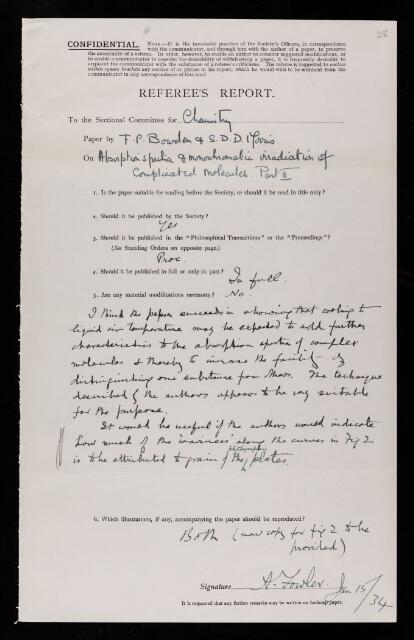Alfred Fowler, Referee's report by Alfred Fowler, on a paper 'Physico-chemical studies of complex organic molecules. Part II.— Absorption spectra at low temperatures' by Frank Philip Bowden and S D D Morris, 15 January 1934, RR/49/28, The Royal Society Archives, London, https://makingscience.royalsociety.org/items/rr_49_28/referees-report-by-alfred-fowler-on-a-paper-physico-chemical-studies-of-complex-organic-molecules-part-ii-absorption-spectra-at-low-temperatures-by-frank-philip-bowden-and-s-d-d-morris, accessed on 12 November 2025