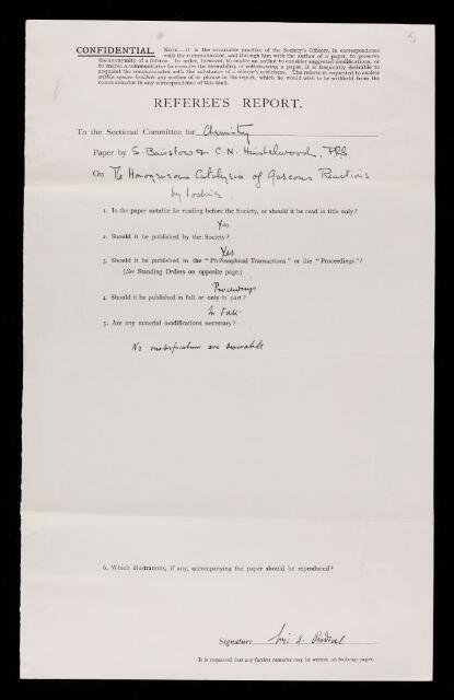 https://makingscience.royalsociety.org/items/rr_49_5/referees-report-by-eric-keightley-rideal-on-a-paper-the-homogeneous-catalysis-of-gaseous-reactions-by-iodine-the-decomposition-of-propionic-aldehyde-and-a-general-discussion-by-s-bairstow-and-cyril-norman-hinshelwood