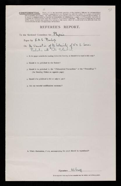 William Lawrence Bragg, Referee's report by William Lawrence Bragg, on a paper 'On the variation of the intensity of K and L series radiation with tube potential' by Eric Henry Stonely Burhop, December 1933, RR/49/50, The Royal Society Archives, London, https://makingscience.royalsociety.org/items/rr_49_50/referees-report-by-william-lawrence-bragg-on-a-paper-on-the-variation-of-the-intensity-of-k-and-l-series-radiation-with-tube-potential-by-eric-henry-stonely-burhop, accessed on 09 February 2026