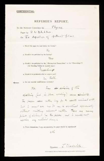 James Chadwick, Referee's report by James Chadwick, on a paper 'The deposition of sputtered films' by Robert William Ditchburn, February 1933, RR/49/94, The Royal Society Archives, London, https://makingscience.royalsociety.org/items/rr_49_94/referees-report-by-james-chadwick-on-a-paper-the-deposition-of-sputtered-films-by-robert-william-ditchburn, accessed on 19 April 2026