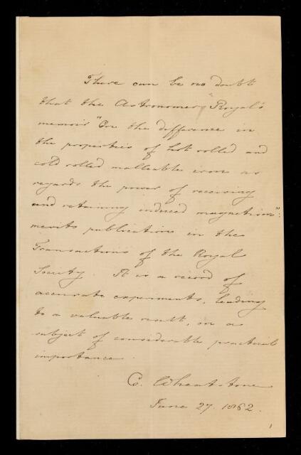 Charles Wheatstone, Referee's report by Charles Wheatstone, on a paper 'On the difference in the magnetic properties of hot-rolled and cold-rolled malleable iron, as regards the power of receiving and retaining induced magnetism of subpermanent character' by George Biddell Airy, 27 June 1862, RR/4/1, The Royal Society Archives, London, https://makingscience.royalsociety.org/items/rr_4_1/referees-report-by-charles-wheatstone-on-a-paper-on-the-difference-in-the-magnetic-properties-of-hot-rolled-and-cold-rolled-malleable-iron-as-regards-the-power-of-receiving-and-retaining-induced-magnetism-of-subpermanent-character-by-george-biddell-airy, accessed on 12 December 2025