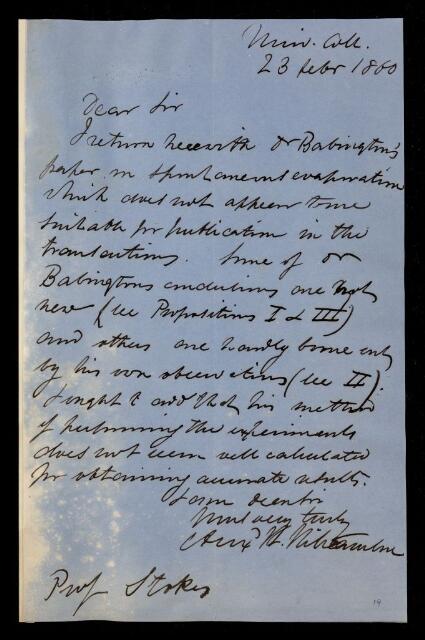 Alexander William Williamson, Referee's report by Alexander William Williamson, on a paper 'On spontaneous evaporation' by Charles Cardale Babington, 23 February 1860, RR/4/10, The Royal Society Archives, London, https://makingscience.royalsociety.org/items/rr_4_10/referees-report-by-alexander-william-williamson-on-a-paper-on-spontaneous-evaporation-by-charles-cardale-babington, accessed on 14 February 2026