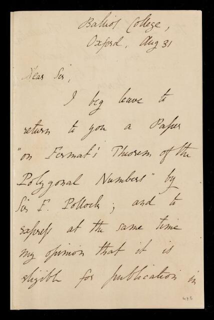 Henry John Stephen Smith, Referee's report by Henry John Stephen Smith, on a paper 'On Fermat's theorem of the polygonal numbers' by Frederick Pollock, 31 August 1861, RR/4/199, The Royal Society Archives, London, https://makingscience.royalsociety.org/items/rr_4_199/referees-report-by-henry-john-stephen-smith-on-a-paper-on-fermats-theorem-of-the-polygonal-numbers-by-frederick-pollock, accessed on 06 February 2026