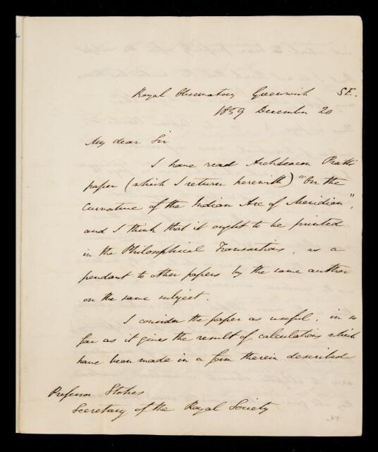 George Biddell Airy, Referee's report by George Biddell Airy, on a paper 'On the curvature of the Indian arc' by John Henry Pratt, 20 December 1859, RR/4/204, The Royal Society Archives, London, https://makingscience.royalsociety.org/items/rr_4_204/referees-report-by-george-biddell-airy-on-a-paper-on-the-curvature-of-the-indian-arc-by-john-henry-pratt, accessed on 12 November 2025