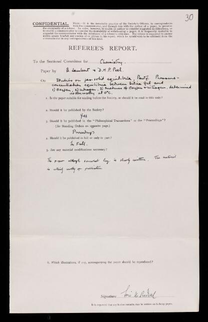 Eric Keightley Rideal, Referee's report by Eric Keightley Rideal, on a paper 'Studies on gas-solid equilibria. Part V.—Pressure-concentration equilibria between silica gel and (1) oxygen, (2) nitrogen, (3) mixtures of oxygen and nitrogen, determined isothermally at 0º C' by Bertram Lambert and David H P Peel, November 1933, RR/50/30, The Royal Society Archives, London, https://makingscience.royalsociety.org/items/rr_50_30/referees-report-by-eric-keightley-rideal-on-a-paper-studies-on-gas-solid-equilibria-part-vpressure-concentration-equilibria-between-silica-gel-and-1-oxygen-2-nitrogen-3-mixtures-of-oxygen-and-nitrogen-determined-isothermally-at-0º-c-by-bertram-lambert-and-david-h-p-peel, accessed on 14 January 2026