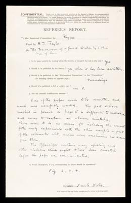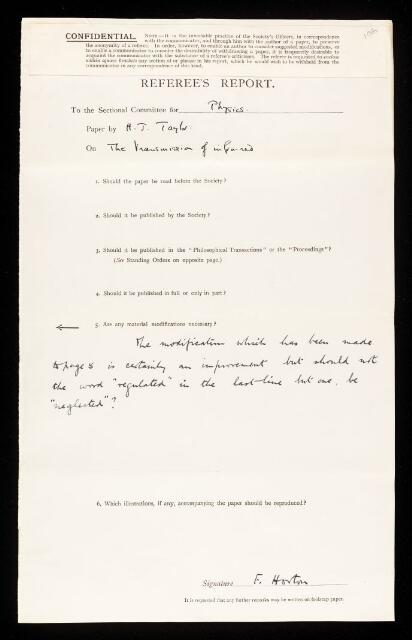 Frank Horton, Second referee's report by Frank Horton, on a paper 'The transmission of infra-red radiation by a thin layer of horn' by H J Taylor, 14 August 1933, RR/51/106, The Royal Society Archives, London, https://makingscience.royalsociety.org/items/rr_51_106/second-referees-report-by-frank-horton-on-a-paper-the-transmission-of-infra-red-radiation-by-a-thin-layer-of-horn-by-h-j-taylor, accessed on 06 March 2026