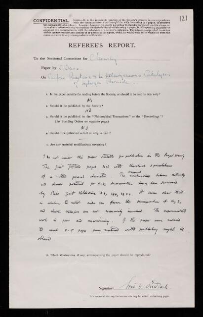Eric Keightley Rideal, Referee's report by Eric Keightley Rideal, on a paper 'Surface reactions and the heterogeneous catalysis of hydrogen peroxide' by J Weiss, October 1934, RR/52/121, The Royal Society Archives, London, https://makingscience.royalsociety.org/items/rr_52_121/referees-report-by-eric-keightley-rideal-on-a-paper-surface-reactions-and-the-heterogeneous-catalysis-of-hydrogen-peroxide-by-j-weiss, accessed on 17 November 2025