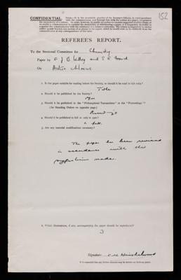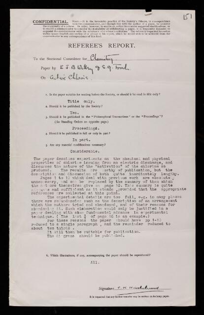 Cyril Norman Hinshelwood, Referee's report by Cyril Norman Hinshelwood, on a paper 'On active chlorine' by E J B Willey and S G Foord, April 1934, RR/52/151, The Royal Society Archives, London, https://makingscience.royalsociety.org/items/rr_52_151/referees-report-by-cyril-norman-hinshelwood-on-a-paper-on-active-chlorine-by-e-j-b-willey-and-s-g-foord, accessed on 13 December 2025