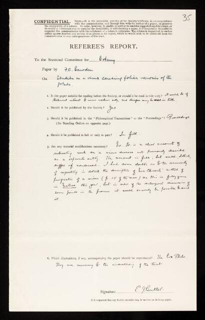 Edwin John Butler, Referee's report by Edwin John Butler, on a paper 'Studies on a virus causing foliar necrosis of the potato' by Frederick Charles Bawden, September 1934, RR/52/35, The Royal Society Archives, London, https://makingscience.royalsociety.org/items/rr_52_35/referees-report-by-edwin-john-butler-on-a-paper-studies-on-a-virus-causing-foliar-necrosis-of-the-potato-by-frederick-charles-bawden, accessed on 08 November 2025