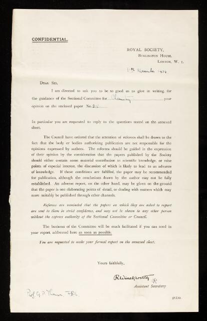 George Paget Thomson, Referee's report by George Paget Thomson, on a paper 'The mobility of sodium on tungsten' by Richard Charles Leslie Bosworth, November 1934, RR/52/66, The Royal Society Archives, London, https://makingscience.royalsociety.org/items/rr_52_66/referees-report-by-george-paget-thomson-on-a-paper-the-mobility-of-sodium-on-tungsten-by-richard-charles-leslie-bosworth, accessed on 06 December 2025