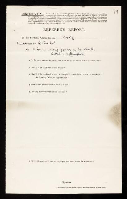 Augustus Daniel Imms, Second referee's report by Augustus Daniel Imms, on a paper 'A hormone causing pupation in the blowfly calliphora erythrocephala' by Gottfried Fraenkel, 25 March 1935, RR/52/79, The Royal Society Archives, London, https://makingscience.royalsociety.org/items/rr_52_79/second-referees-report-by-augustus-daniel-imms-on-a-paper-a-hormone-causing-pupation-in-the-blowfly-calliphora-erythrocephala-by-gottfried-fraenkel, accessed on 13 February 2026