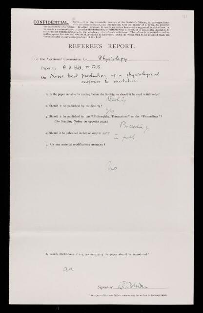 Referee's report by Edgar Douglas Adrian, 1st Baron Adrian of Cambridge, on a paper 'Nerve heat production as a physiological response to excitation' by Archibald Vivian Hill