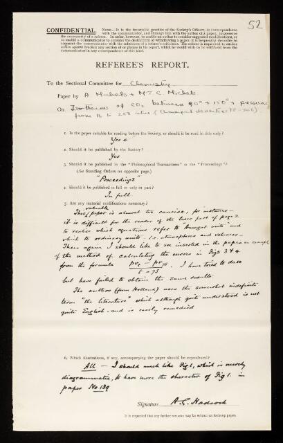 Albert George Hadcock, Referee's report by Albert George Hadcock, on a paper 'Isotherms of CO2 between 0° and 150° and pressures from 16 to 250 atm (Amagat densities 18-206)' by A Michels and C Michels, 1935, RR/54/52, The Royal Society Archives, London, https://makingscience.royalsociety.org/items/rr_54_52/referees-report-by-albert-george-hadcock-on-a-paper-isotherms-of-co2-between-0-and-150-and-pressures-from-16-to-250-atm-amagat-densities-18-206-by-a-michels-and-c-michels, accessed on 11 April 2026