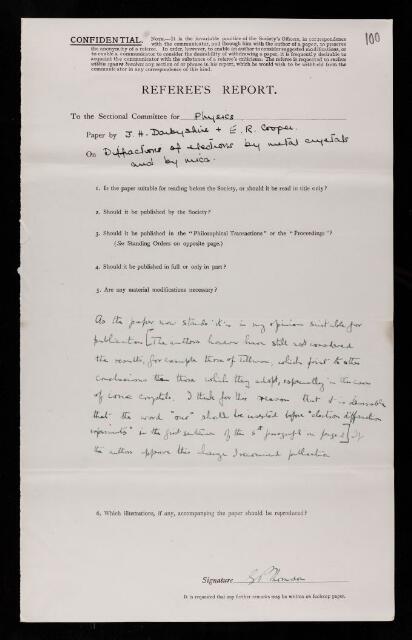 George Paget Thomson, Second referee's report by George Paget Thomson, on a paper 'Diffraction of electrons by metal crystals and by mica' by J A Darbyshire and E R Cooper, June 1935, RR/55/100, The Royal Society Archives, London, https://makingscience.royalsociety.org/items/rr_55_100/second-referees-report-by-george-paget-thomson-on-a-paper-diffraction-of-electrons-by-metal-crystals-and-by-mica-by-j-a-darbyshire-and-e-r-cooper, accessed on 09 November 2025