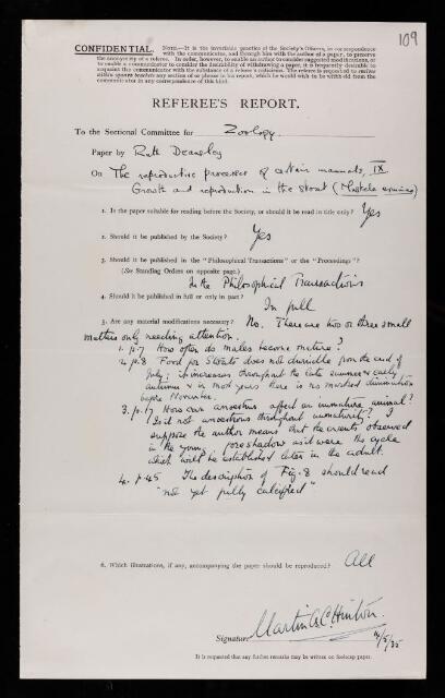 Martin Alister Campbell Hinton, Referee's report by Martin Alister Campbell Hinton, on a paper 'The reproductive processes of certain mammals. Part IX—Growth and reproduction in the stoat (Mustela erminea)' by Ruth Deanesley, 14 May 1935, RR/55/109, The Royal Society Archives, London, https://makingscience.royalsociety.org/items/rr_55_109/referees-report-by-martin-alister-campbell-hinton-on-a-paper-the-reproductive-processes-of-certain-mammals-part-ixgrowth-and-reproduction-in-the-stoat-mustela-erminea-by-ruth-deanesley, accessed on 06 December 2025