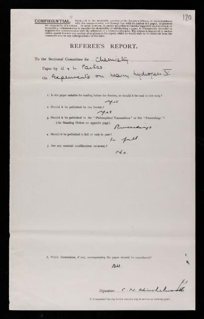 Cyril Norman Hinshelwood, Referee's report by Cyril Norman Hinshelwood, on a paper 'Experiments on heavy hydrogen - V—The elementary reactions of light and heavy hydrogen. The thermal conversion of ortho-deuterium and the interaction of hydrogen and deuterium' by Adalbert Farkas, April 1935, RR/55/120, The Royal Society Archives, London, https://makingscience.royalsociety.org/items/rr_55_120/referees-report-by-cyril-norman-hinshelwood-on-a-paper-experiments-on-heavy-hydrogen-vthe-elementary-reactions-of-light-and-heavy-hydrogen-the-thermal-conversion-of-ortho-deuterium-and-the-interaction-of-hydrogen-and-deuterium-by-adalbert-farkas, accessed on 14 February 2026