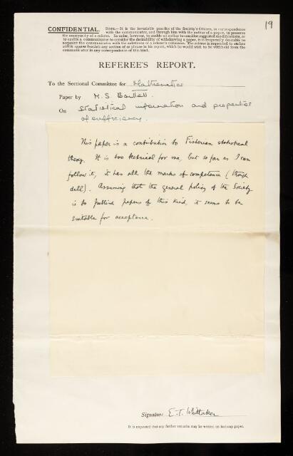 Edmund Taylor Whittaker, Referee's report by Edmund Taylor Whittaker, on a paper 'Statistical information and properties of sufficiency' by Maurice Stevenson Bartlett, October 1935, RR/55/19, The Royal Society Archives, London, https://makingscience.royalsociety.org/items/rr_55_19/referees-report-by-edmund-taylor-whittaker-on-a-paper-statistical-information-and-properties-of-sufficiency-by-maurice-stevenson-bartlett, accessed on 08 November 2025