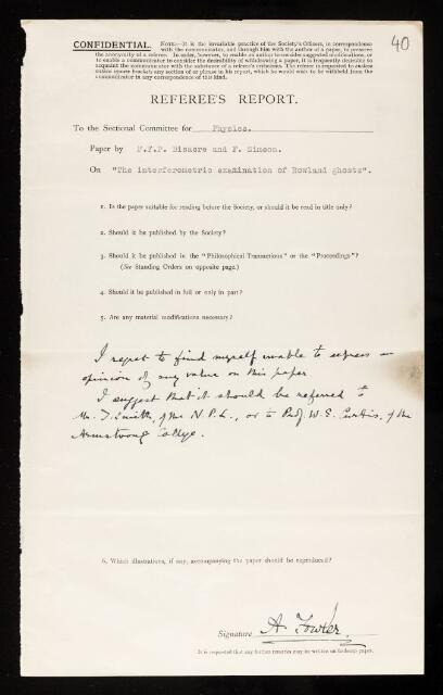 Alfred Fowler, Referee's report by Alfred Fowler, on a paper 'The interferometric examination of Rowland ghosts' by F F P Bisacre and F Simeon, October 1936, RR/55/40, The Royal Society Archives, London, https://makingscience.royalsociety.org/items/rr_55_40/referees-report-by-alfred-fowler-on-a-paper-the-interferometric-examination-of-rowland-ghosts-by-f-f-p-bisacre-and-f-simeon, accessed on 15 March 2026