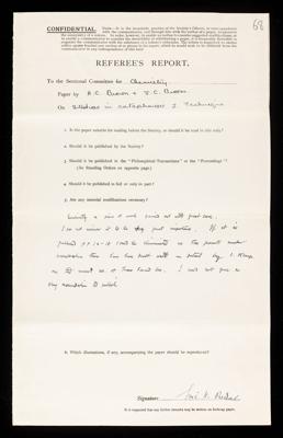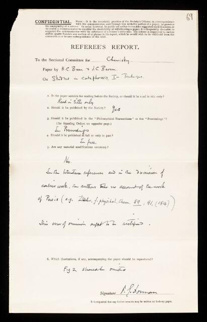 Frederick George Donnan, Referee's report by Frederick George Donnan, on a paper 'Studies in microcataphoresis - I—Technique' by H C Brown and J C Broom, November 1935, RR/55/69, The Royal Society Archives, London, https://makingscience.royalsociety.org/items/rr_55_69/referees-report-by-frederick-george-donnan-on-a-paper-studies-in-microcataphoresis-itechnique-by-h-c-brown-and-j-c-broom, accessed on 06 March 2026