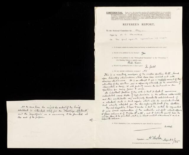 Alfred Fowler, Referee's report by Alfred Fowler, on a paper 'The first spark spectrum of copper' by Allen Goodrich Shenstone, 02 August 1935, RR/56/108, The Royal Society Archives, London, https://makingscience.royalsociety.org/items/rr_56_108/referees-report-by-alfred-fowler-on-a-paper-the-first-spark-spectrum-of-copper-by-allen-goodrich-shenstone, accessed on 21 January 2026