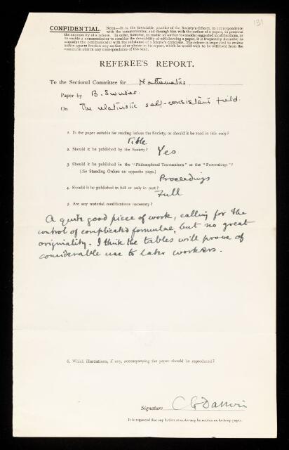 Charles Galton Darwin, Referee's report by Charles Galton Darwin, on a paper 'The relativistic self-consistent field' by Bertha Swirles, June 1935, RR/56/131, The Royal Society Archives, London, https://makingscience.royalsociety.org/items/rr_56_131/referees-report-by-charles-galton-darwin-on-a-paper-the-relativistic-self-consistent-field-by-bertha-swirles, accessed on 08 November 2025