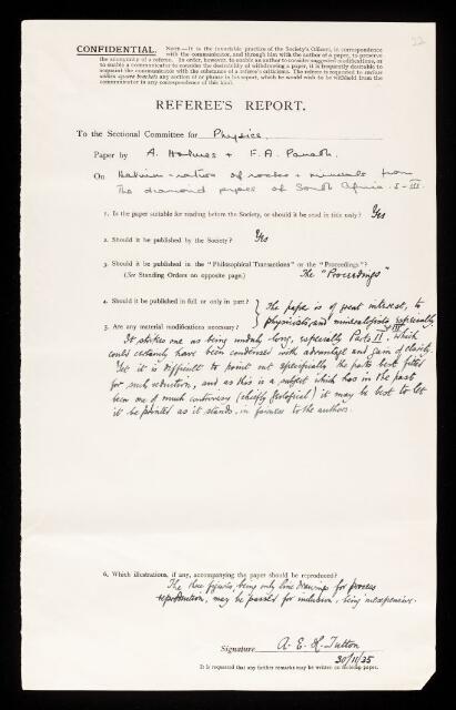 https://makingscience.royalsociety.org/items/rr_56_22/referees-report-by-alfred-edwin-howard-tutton-on-a-paper-helium-ratios-of-rocks-and-minerals-from-the-diamond-pipes-of-south-africa-by-arthur-holmes-and-friedrich-adolf-paneth