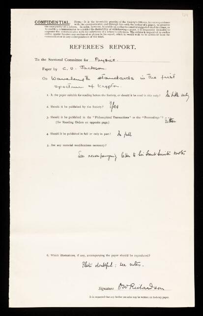 Owen Willans Richardson, Referee's report by Owen Willans Richardson, on a paper 'Wave- length standards in the first spectrum of krypton' by C V Jackson, February 1936, RR/56/44, The Royal Society Archives, London, https://makingscience.royalsociety.org/items/rr_56_44/referees-report-by-owen-willans-richardson-on-a-paper-wave-length-standards-in-the-first-spectrum-of-krypton-by-c-v-jackson, accessed on 20 January 2026