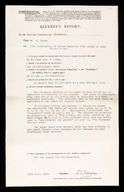 Referee's report by Gilbert Thomas Morgan, on a paper 'On the interaction of carbon monoxide with nickel at high temperatures' by G Bryce