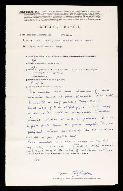 William Edward Curtis, Referee's report by William Edward Curtis, on a paper 'Spectra of SeO and SeO2' by R K Asundi, Mohammad Jan-Khan and R Samuel, May 1936, RR/57/81, The Royal Society Archives, London, https://makingscience.royalsociety.org/items/rr_57_81/referees-report-by-william-edward-curtis-on-a-paper-spectra-of-seo-and-seo2-by-r-k-asundi-mohammad-jan-khan-and-r-samuel, accessed on 12 November 2025