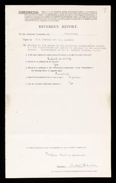 Arthur Harden, Referee's report by Arthur Harden, on a paper 'Studies on the nature of the amphibian organization centre V—The distribution and nature of glycogen in the amphibian embryo' by Norman G Heatley and P E Lindahl, December 1936, RR/58/8, The Royal Society Archives, London, https://makingscience.royalsociety.org/items/rr_58_8/referees-report-by-arthur-harden-on-a-paper-studies-on-the-nature-of-the-amphibian-organization-centre-vthe-distribution-and-nature-of-glycogen-in-the-amphibian-embryo-by-norman-g-heatley-and-p-e-lindahl, accessed on 13 December 2025