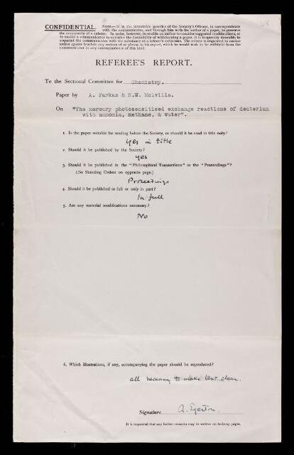Alfred Charles Glyn Egerton, Referee's report by Alfred Charles Glyn Egerton, on a paper 'The mercury photosensitized exchange reactions of deuterium with ammonia, methane, and water' by A Farkas and Harry Work Melville, July 1936, RR/59/68, The Royal Society Archives, London, https://makingscience.royalsociety.org/items/rr_59_68/referees-report-by-alfred-charles-glyn-egerton-on-a-paper-the-mercury-photosensitized-exchange-reactions-of-deuterium-with-ammonia-methane-and-water-by-a-farkas-and-harry-work-melville, accessed on 07 February 2026