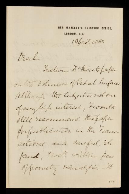 William Spottiswoode, Referee's report by William Spottiswoode, on a paper 'On the volumes of pedal surfaces' by Thomas Archer Hirst, 01 April 1863, RR/5/119, The Royal Society Archives, London, https://makingscience.royalsociety.org/items/rr_5_119/referees-report-by-william-spottiswoode-on-a-paper-on-the-volumes-of-pedal-surfaces-by-thomas-archer-hirst, accessed on 10 March 2026