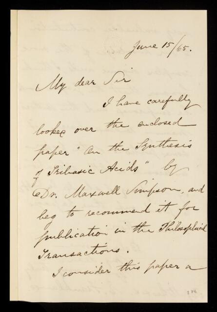 Edward Frankland, Referee's report by Edward Frankland, on a paper 'On the synthesis of tribasic acids' by Maxwell Simpson, 15 June 1865, RR/5/150, The Royal Society Archives, London, https://makingscience.royalsociety.org/items/rr_5_150/referees-report-by-edward-frankland-on-a-paper-on-the-synthesis-of-tribasic-acids-by-maxwell-simpson, accessed on 12 November 2025
