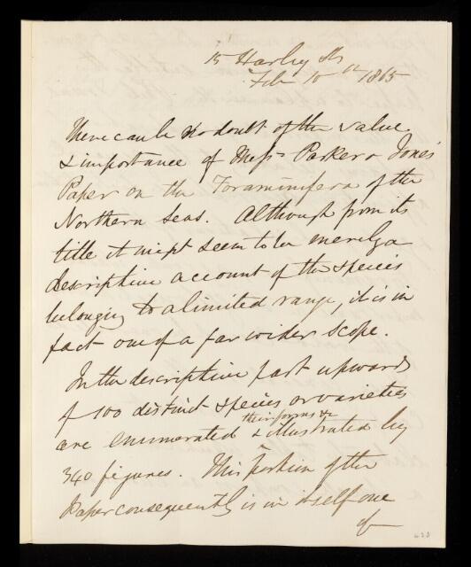 George Busk, Referee's report by George Busk, on a paper 'On some foraminifera from the North Atlantic and Arctic Oceans, including Davis Straits and Baffin's Bay' by William Kitchen Parker and Thomas Rupert Jones, 10 February 1865, RR/5/171, The Royal Society Archives, London, https://makingscience.royalsociety.org/items/rr_5_171/referees-report-by-george-busk-on-a-paper-on-some-foraminifera-from-the-north-atlantic-and-arctic-oceans-including-davis-straits-and-baffins-bay-by-william-kitchen-parker-and-thomas-rupert-jones, accessed on 17 January 2026