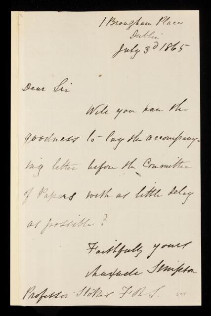 Letter from Maxwell Simpson, to George Gabriel Stokes, regarding a paper 'On the synthesis of tribasic acids' by Maxwell Simpson, 03 July 1865, RR/5/245, The Royal Society Archives, London, https://makingscience.royalsociety.org/items/rr_5_245/letter-from-maxwell-simpson-to-george-gabriel-stokes-regarding-a-paper-on-the-synthesis-of-tribasic-acids-by-maxwell-simpson, accessed on 07 November 2025