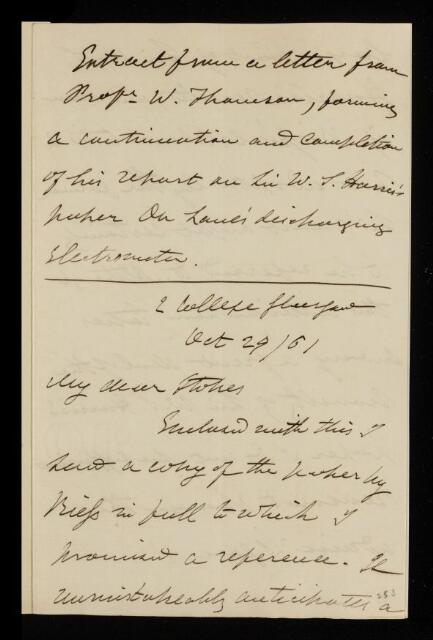 Letter from William Thomson, 1st Baron Kelvin, to George Gabriel Stokes, regarding a paper 'On some new phenomena of residuary charge, and the law of exploding distance of electrical accumulation on coated glass' by William Snow Harris