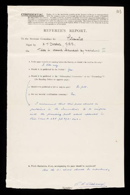George Ridsdale Goldsbrough, Referee's report by George Ridsdale Goldsbrough, on a paper 'Tides in oceans bounded by meridians III. Ocean bounded by complete meridian semidiurnal tides' by Arthur Thomas Doodson, December 1937, RR/61/113, The Royal Society Archives, London, https://makingscience.royalsociety.org/items/rr_61_113/referees-report-by-george-ridsdale-goldsbrough-on-a-paper-tides-in-oceans-bounded-by-meridians-iii-ocean-bounded-by-complete-meridian-semidiurnal-tides-by-arthur-thomas-doodson, accessed on 12 November 2025