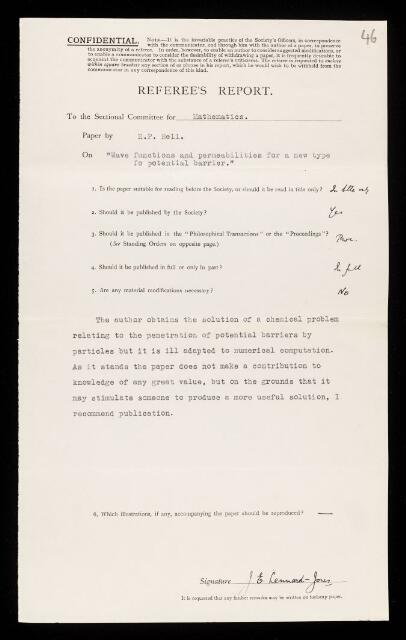 John Edward Lennard-Jones, Referee's report by John Edward Lennard-Jones, on a paper 'Wave functions and permeabilities for a new type of potential barrier' by R P Bell, January 1937, RR/61/46, The Royal Society Archives, London, https://makingscience.royalsociety.org/items/rr_61_46/referees-report-by-john-edward-lennard-jones-on-a-paper-wave-functions-and-permeabilities-for-a-new-type-of-potential-barrier-by-r-p-bell, accessed on 11 November 2025