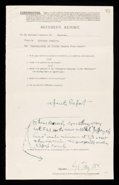Geoffrey Ingram Taylor, Second referee's report by Geoffrey Ingram Taylor, on a paper 'Instability of fluids heated from below' by Krishna Chandra, May 1937, RR/61/83, The Royal Society Archives, London, https://makingscience.royalsociety.org/items/rr_61_83/second-referees-report-by-geoffrey-ingram-taylor-on-a-paper-instability-of-fluids-heated-from-below-by-krishna-chandra, accessed on 13 March 2026