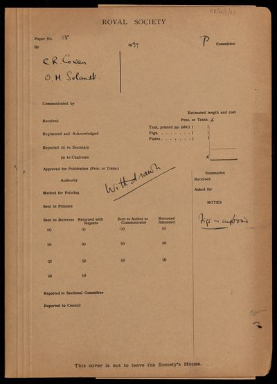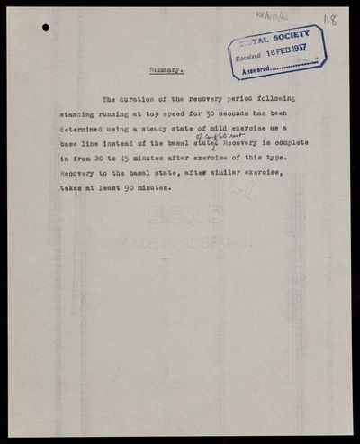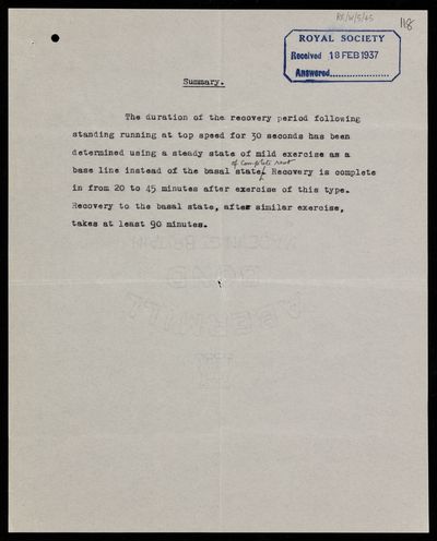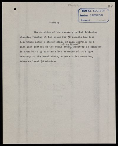 Original summary note from the Royal Society editorial department, for a paper 'The duration of the recovery period following strenuous muscular exercise, measured to a base line of steady mild exercise' by C R Cowan and O[Omond] M[Mckillop] Solandt