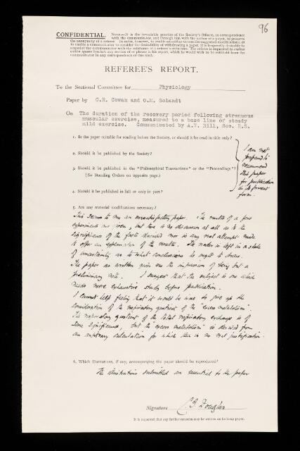 Claude Gordon Douglas, Referee's report by Claude Gordon Douglas, on a paper 'The duration of the recovery period following strenuous muscular exercise, measured to a base line of steady mild exercise' by C R Cowan and C M Solandt, March 1937, RR/61/96, The Royal Society Archives, London, https://makingscience.royalsociety.org/items/rr_61_96/referees-report-by-claude-gordon-douglas-on-a-paper-the-duration-of-the-recovery-period-following-strenuous-muscular-exercise-measured-to-a-base-line-of-steady-mild-exercise-by-c-r-cowan-and-c-m-solandt, accessed on 13 February 2026