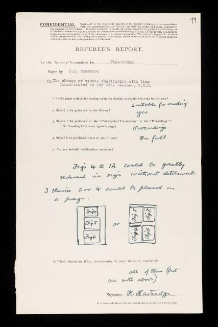 Hamilton Hartridge, Referee's report by Hamilton Hartridge, on a paper 'The change of visual sensitivity with time' by B H Crawford, March 1937, RR/61/99, The Royal Society Archives, London, https://makingscience.royalsociety.org/items/rr_61_99/referees-report-by-hamilton-hartridge-on-a-paper-the-change-of-visual-sensitivity-with-time-by-b-h-crawford, accessed on 23 January 2026
