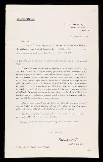 Hamilton Hartridge, Referee's report by Hamilton Hartridge, on a paper 'The foveal light adaptation process' by W D Wright, November 1936, RR/62/103, The Royal Society Archives, London, https://makingscience.royalsociety.org/items/rr_62_103/referees-report-by-hamilton-hartridge-on-a-paper-the-foveal-light-adaptation-process-by-w-d-wright, accessed on 12 March 2026