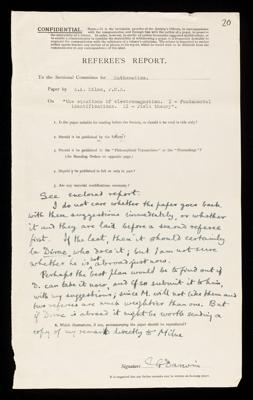 Paul Adrien Maurice Dirac, Second referee's report by Paul Adrien Maurice Dirac, on a paper 'The equations of electromagnetism. I - Fundamental identifications. II - Field theory' by Edward Arthur Milne, January 1938, RR/63/22, The Royal Society Archives, London, https://makingscience.royalsociety.org/items/rr_63_22/second-referees-report-by-paul-adrien-maurice-dirac-on-a-paper-the-equations-of-electromagnetism-i-fundamental-identifications-ii-field-theory-by-edward-arthur-milne, accessed on 09 February 2026