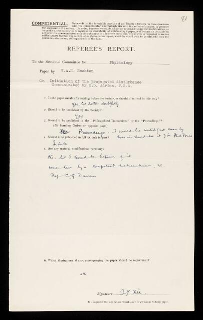 Archibald Vivian Hill, Referee's report by Archibald Vivian Hill, on a paper 'Initiation of the propagated disturbance' by William Albert Hugh Rushton, September 1937, RR/63/81, The Royal Society Archives, London, https://makingscience.royalsociety.org/items/rr_63_81/referees-report-by-archibald-vivian-hill-on-a-paper-initiation-of-the-propagated-disturbance-by-william-albert-hugh-rushton, accessed on 10 December 2025