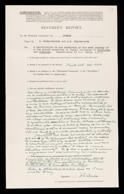 Referee's report by Alexander Craig Aitken, on a paper 'A contribution to our knowledge of the wood anatomy of a few plants occurring in Bengal belonging to Meliaceae and Rutaceae' by S[Syed] Hedayetullah and A K Chakravorty