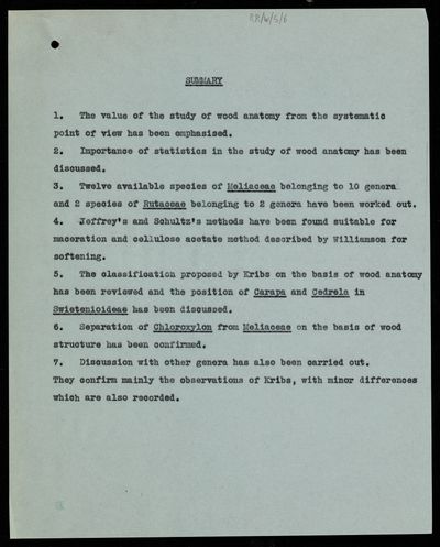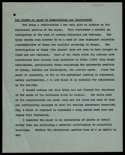 Copy of Referee's comments [by Alexander Craig Aitken], on a paper 'A contribution to our knowledge of the wood-anatomy of a few plants occurring in Bengal belonging to Meliaceae and Rutaceae' by S [Syed] Hedayetullah and A K Chakravorty